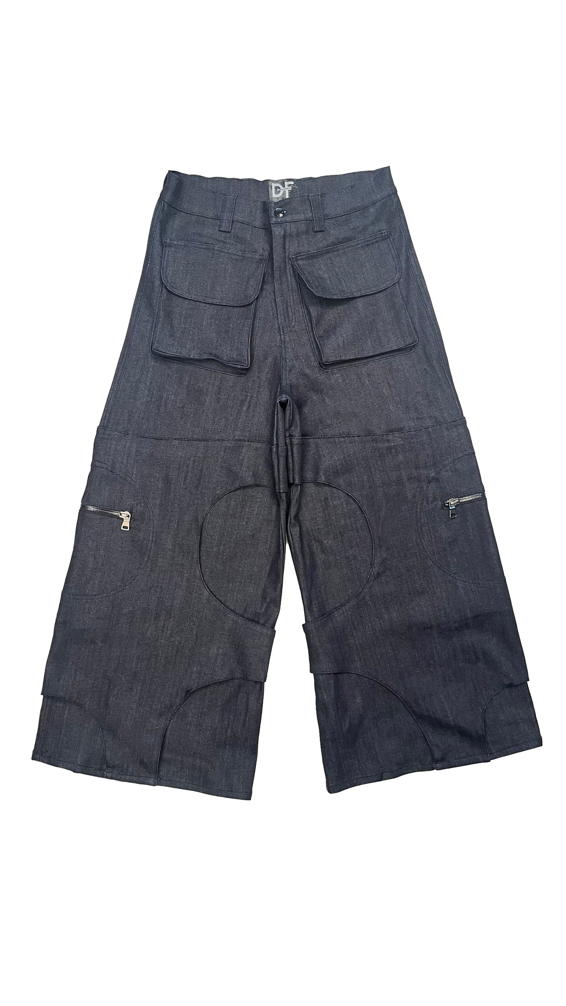 The RADIUS CARGO PANTS reimagine wide-leg denim through refined construction. Cut from 12oz Japanese denim, the design features rounded overlay panels unlike any other. Dual front cargo pockets and circular side zip compartments add functional storage, while the rounded back-pocket detailing completes a silhouette that’s both architectural and distinctly DF.